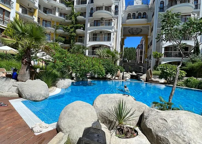 Harmony Suites Monte Carlo ferielejlighed med udsigt over poolen har et et dampbad, et behandlingsrum og Jacuzzi. Gæsterne kan finde Cacao Strand inden for 4 km og Den Gamle By i Nessebar inden for 6 km fra indkvarteringen.